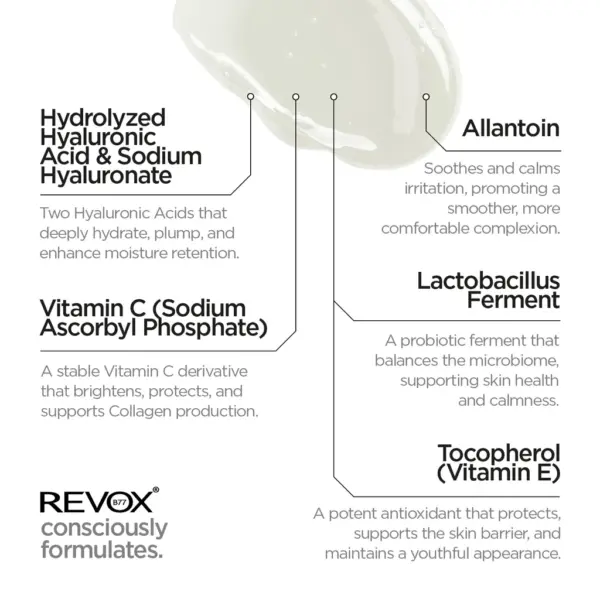 Η σύνθεσή του συνδυάζει Υαλουρονικό Οξύ για βαθιά ενυδάτωση, προβιοτικά για ενίσχυση του skin barrier και Βιταμίνη C για λάμψη και προστασία, χαρίζοντας πιο λεία, γεμάτη και υγιή όψη στο δέρμα.